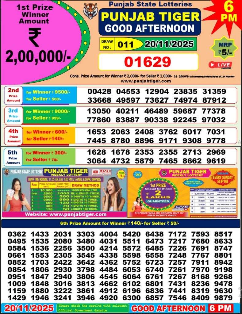 20.11.2020 Panjub Lottery Result: The Indian state of Punjab is known as the second most educated state in India. This state launched a lottery system in 2000 following several rules and regulations, which were approved by the state government. After the launch of this lottery system, it gained a lot of popularity among lottery lovers. The main goal of Punjab Tiger Lottery is to create entertainment and financial benefits among the common people, where you can win a huge amount of money by investing a small amount.